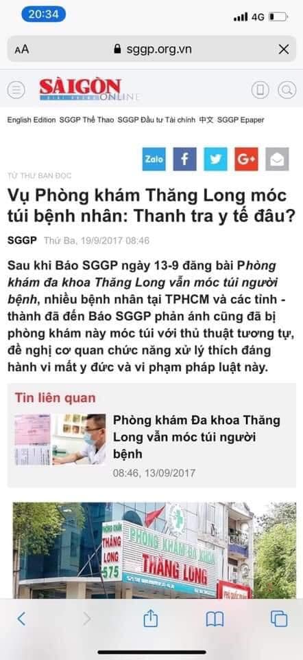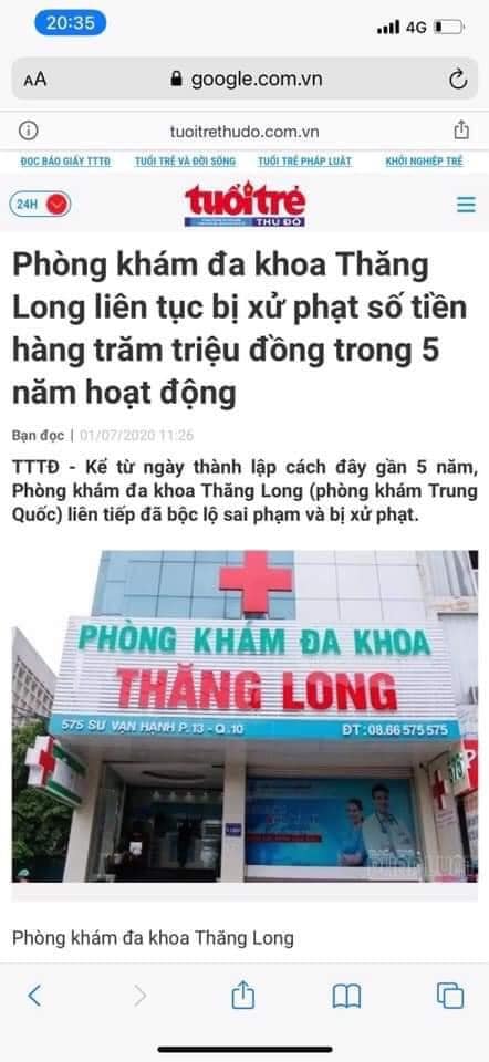 Mình vẫn chưa hoàn hồn, sau đó gặp bạn bè hỏi thăm bắt đầu mình mới tỉnh táo ra, cảm thấy có vài chi tiết không đúng. Thế là mình lại tìm phòng khám Đa Khoa Thăng Long thêm lần nữa. Mới ra những kết quả đáng sợ như đây là phòng khám của Trung Quốc nổi tiếng moi tiền của bệnh nhân, mỗi ca toàn moi từ 40-50tr trở lên. Lên báo đều đặn từ 2017 đến 2020. Sở Y Tế đến phạt và mỗi lần chỉ tầm 50 triệu (lừa 1-2 trường hợp là họ đã đủ tiền để đóng tiền phạt). Cũng có những bài nói tốt về phòng khám (đây là bài mình vô tình đọc trúng và cảm thấy an tâm nên đến khám) nhưng giờ thì mình đã rõ đó là seeders rồi.