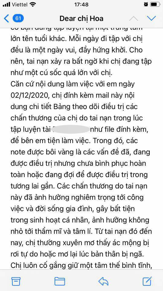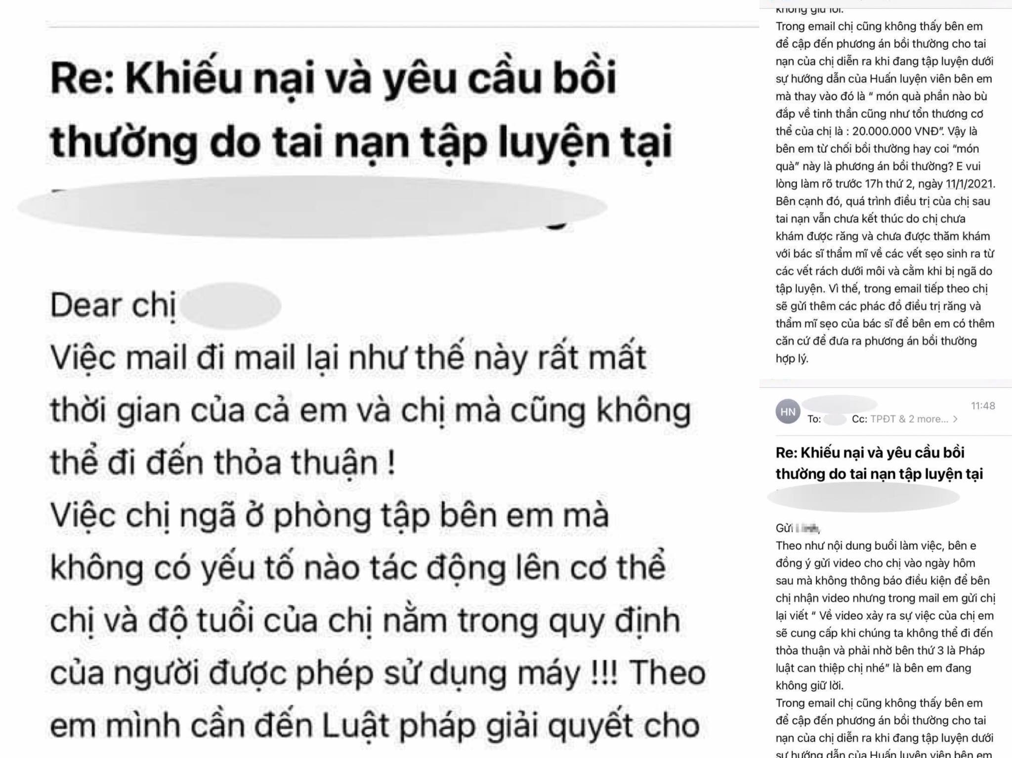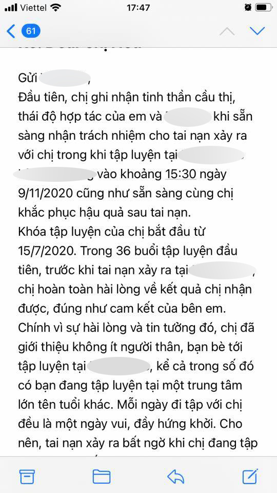 Đến ngày 7/1, bạn Linh thay mặt công ty phản hồi lại email khiếu nại của em theo yêu cầu của gia đình. Xét thấy lời lẽ cũng lịch sự, em mail lại và nói sẽ cung cấp thêm phác đồ điều trị răng và thẩm mĩ sẹo trên mặt để bên đó có căn cứ xem lại phương án bồi thường thì bạn Linh từ chối làm việc với em, nói rằng công ty không liên đới tới tai nạn đó vì: "Việc chị ngã ở phòng tập bên em mà không có yếu tố nào tác động lên cơ thể chị và độ tuổi của chị nằm trong quy định của người được phép sử dụng máy" và thách thức em đưa sự việc ra pháp luật.