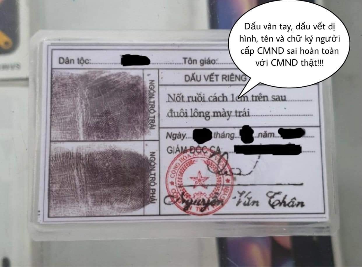 Chứng cứ chứng minh: Qua rất nhiều dấu hiệu giả mạo trên Giấy CMND giả nêu trên, có thể suy đoán kẻ gian chỉ biết được các thông tin trên Giấy CMND thật BẰNG KÝ TỰ KHÔNG DẤU, và chưa từng được nhìn qua giấy CMND thật nên thông tin người cấp giấy CMND và mô tả dấu vết riêng, dấu vân tay trên giấy CMND giả đều sai.