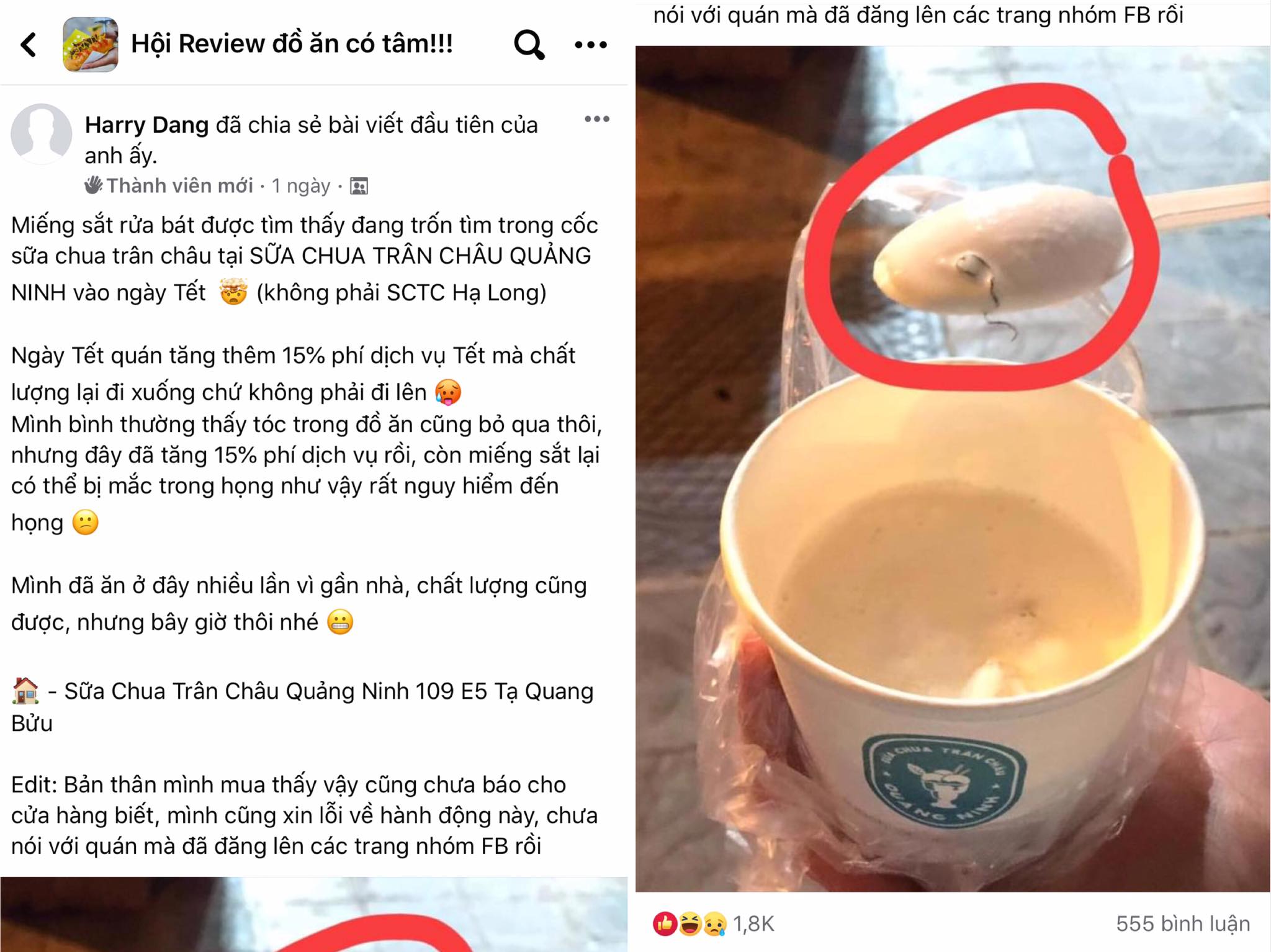 “Miếng sắt rửa bát được tìm thấy đang trốn tìm trong cốc sữa chua trân châu tại SỮA CHUA TRÂN CHÂU QUẢNG NINH vào ngày Tết (không phải SCTC Hạ Long).